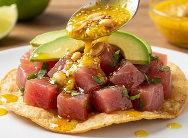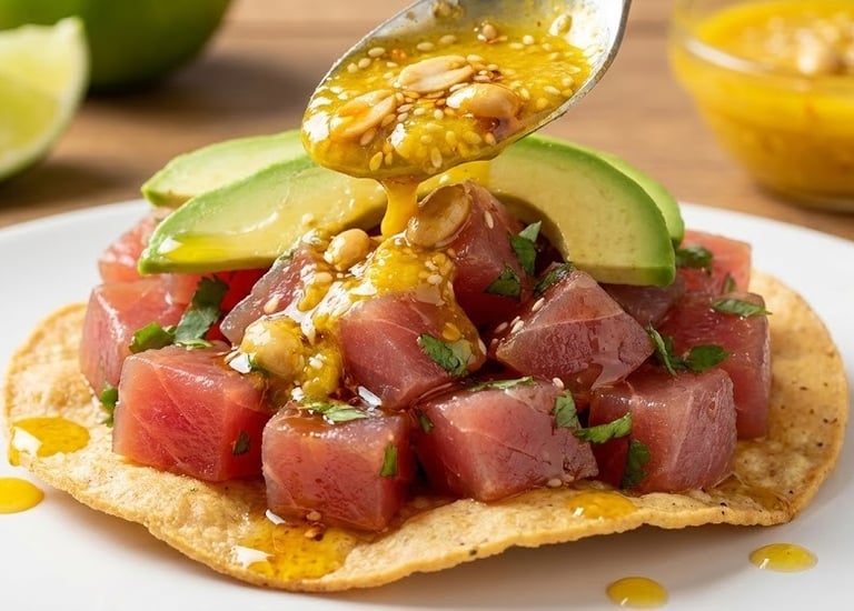 Olvídate del sushi. Cubos de atún fresco marinados en soya y limón, montados sobre nuestra Tostada de Maíz Dorado. El secreto no es el pescado, es el final: una cucharada generosa de Salsa Gourmet de Semillas. El cacahuate y el ajonjolí de la salsa se mezclan con la soya para crear un sabor oriental-tapatío adictivo.