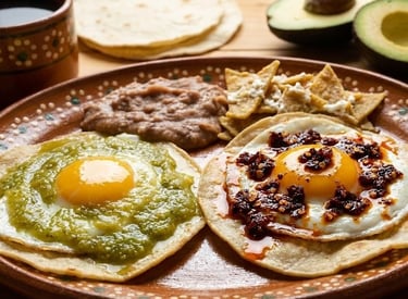 El desayuno de campeones. Dos huevos estrellados sobre tortilla frita. Uno bañado en salsa verde cocida y el otro cubierto con nuestra Salsa Macha de Yahualica. El sabor ahumado del chile seco te recordará al sazón de la abuela.