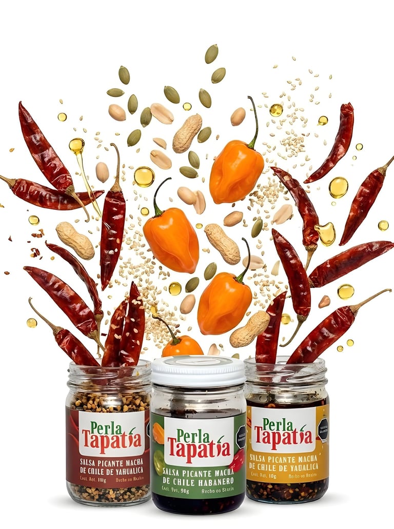 Chile de árbol de Yahualica, aceite de semilla de uva, ajonjolí, cacahuate, ajo, sal yodada.
